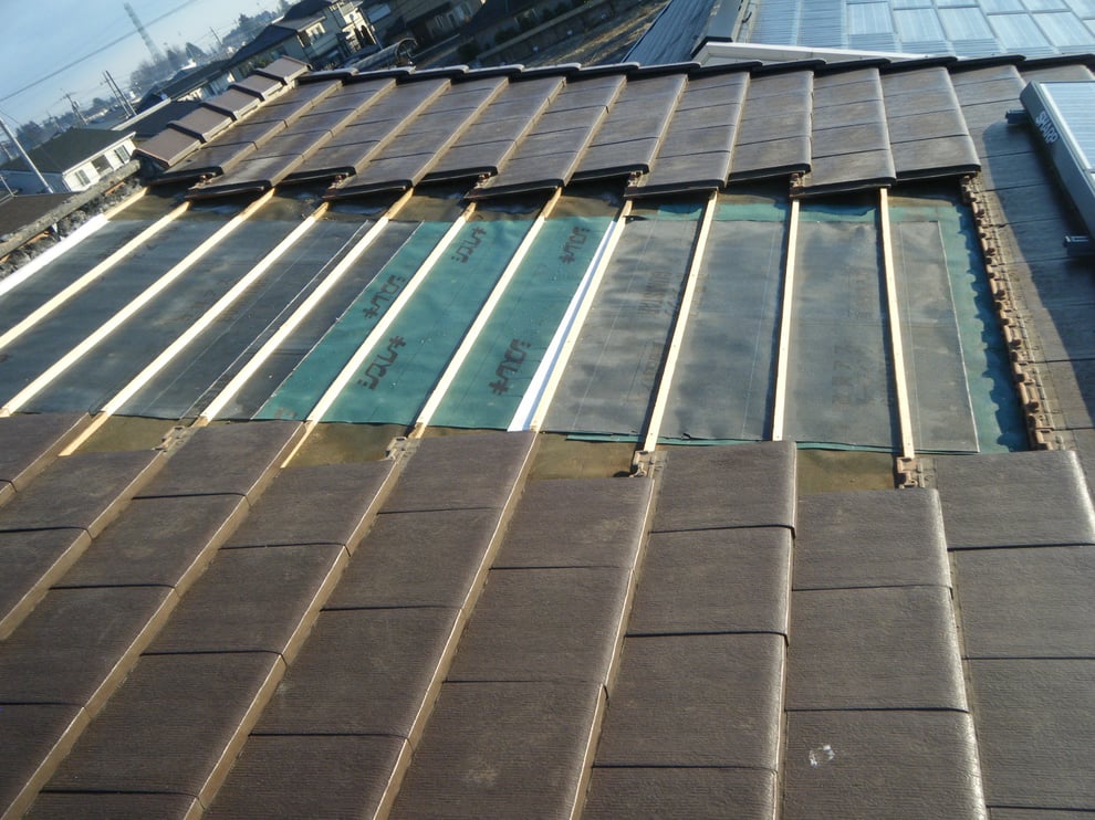 傷んだ屋根野地合板を交換し、新規ルーフィングと瓦桟木を施工した様子です。
