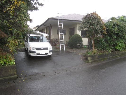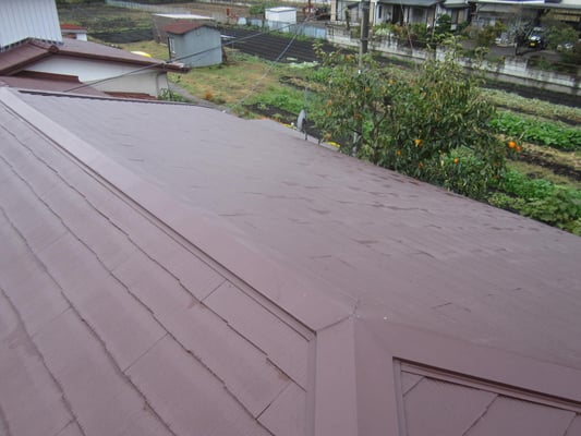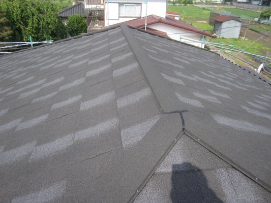 既存化粧スレート(コロニアル)屋根の様子です。築40年程経つ平屋のお宅で、近年屋根塗装をしてから雨漏れが起きるようになってしまったとのことでした。