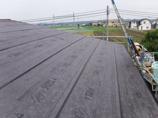 その後、裏がシールテープの様に粘着性がある自着性ゴムアスルーフィングを既存屋根の上に張り付けていきます。