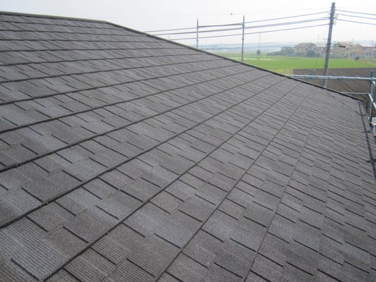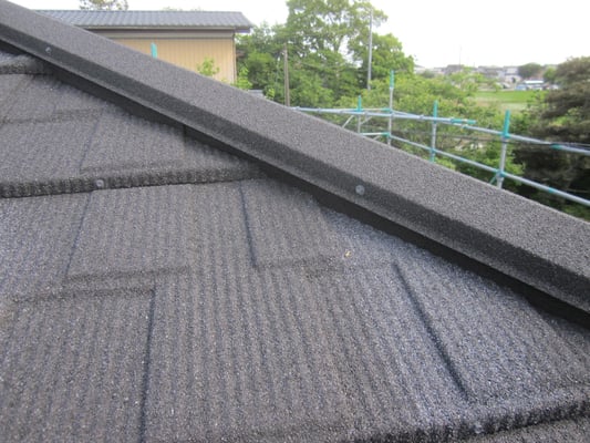 板金の屋根ですが、プレス成型の上に天然石を吹き付けており、まるで瓦のような質感を醸し出しています。軽量屋根材でのカバー工法工事ではぜひこの石付き板金屋根をご検討下さい。