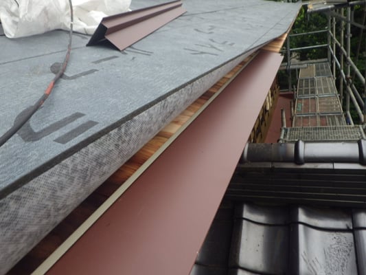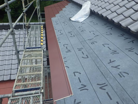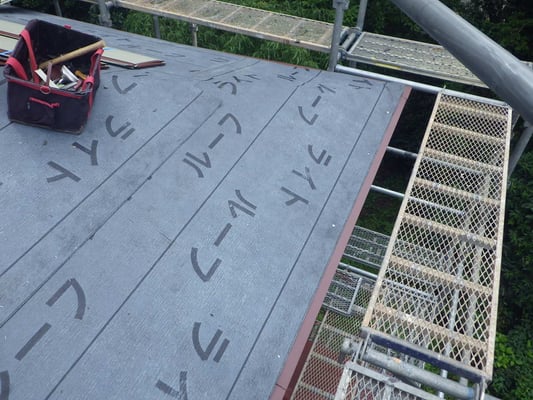 既存屋根材を撤去し、ゴムアスルーフィングを施工し、屋根材本体を施工し始めている様子です。