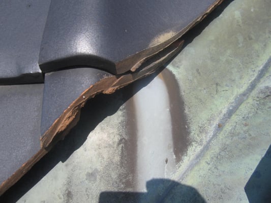 和瓦屋根のお宅で築25年くらい経った銅製谷板金は、程度の差はありますが、この様に腐食して材厚が薄くなります。