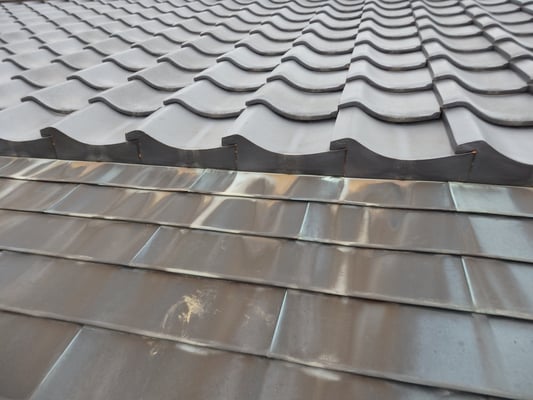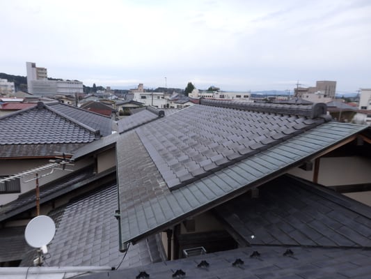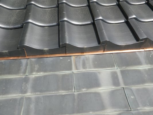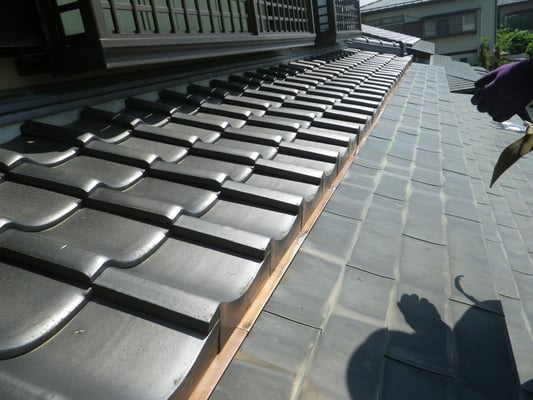 腰葺き屋根(奴葺き)とは軒先から軒桁(のきげた)芯までぐらいを銅板等の金属屋根で葺き、軒桁から上部を瓦葺きで葺かれた形状のことをいいます。