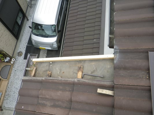 袖部に貫板を施工し、ケラバ捨て水切板金を施工します。板金を施工することで瓦の下に入り込んだ雨水の流れを軒樋へと導きます。