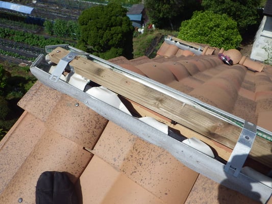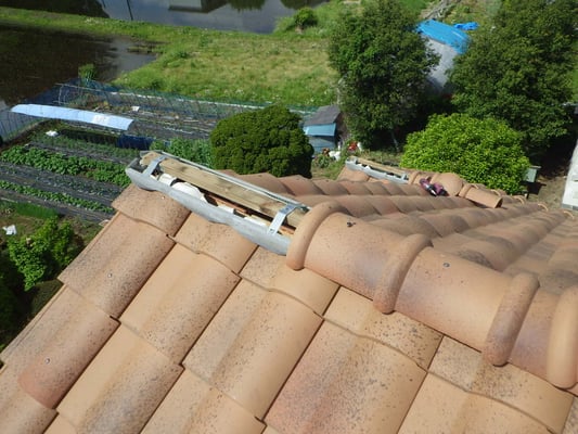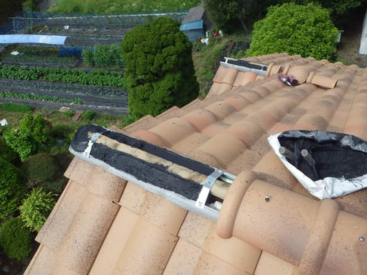 内部に持ち込まれた巣の材料を取り出し、南蛮漆喰にて開けられた穴を埋め、更に棟内部にも充填しました。