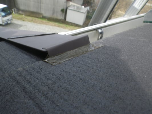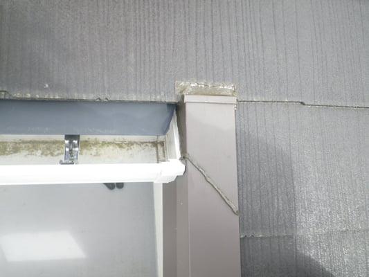 次に上部屋根から流れてくる雨水がケラバ水切を伝ってこぼれ落ちる雨水を再度屋根材へ戻すための措置を、こちらもシリコンコーキングにて行いました。