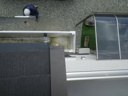 具体的には一度ケラバ水切の端部を展開し、軒樋内側に端部が届くように調整し、再施工しました。