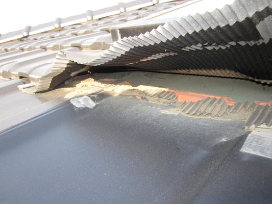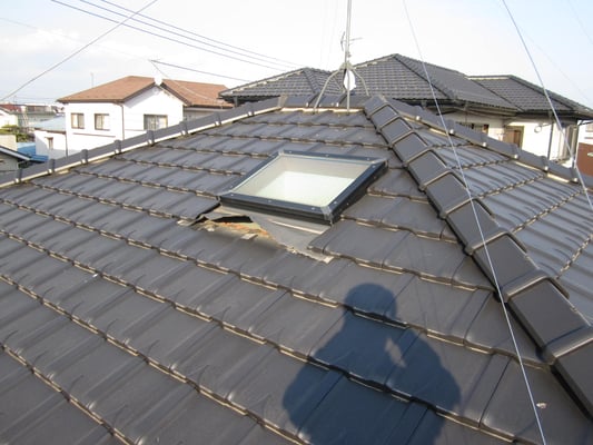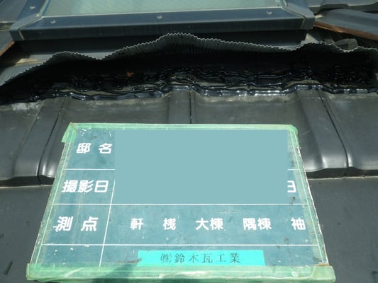 屋根材(陶器瓦)と鉛板を接着していたシリコンコーキングの維持力が弱まったせいか、鉛板を接着する力が無くなり、強風に煽られた際に鉛板が浮き上がったものと思われます。