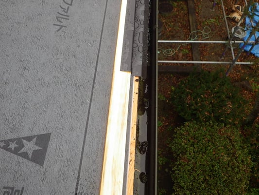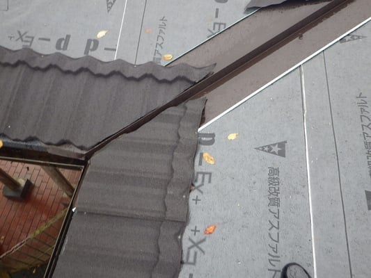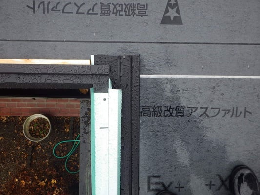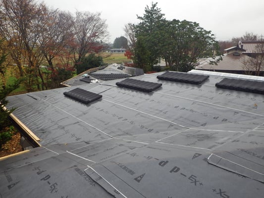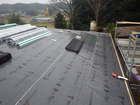 これは既存屋根材の上から、下葺き材のルーフィング(防水シート)を貼り、新規屋根材を屋根上に配置した様子です。