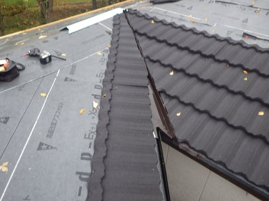 今回屋根カバー工法で使用する石付き板金屋根材、Tルーフを葺き始めます。