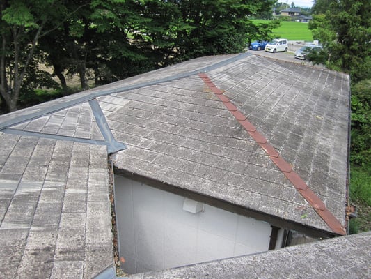 かなり劣化が進んでいて、化粧スレートの欠け・割れ・コケ付着・棟板金の錆びが目立ちます。