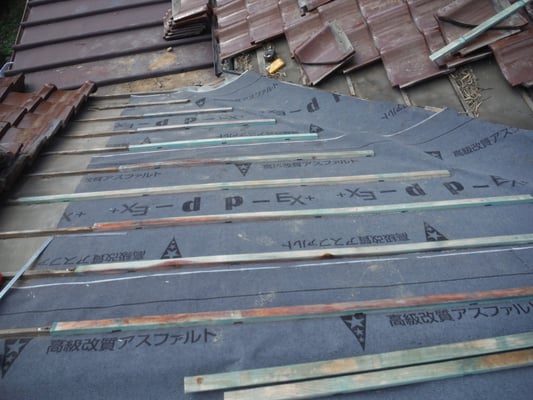 既存ルーフィングの上に新規下葺きルーフィングを被せ、新規谷板金を施工していきます。