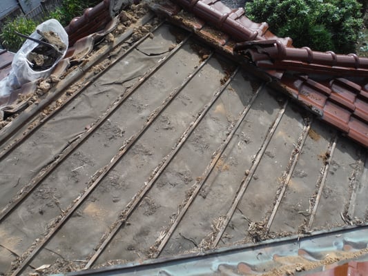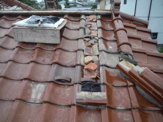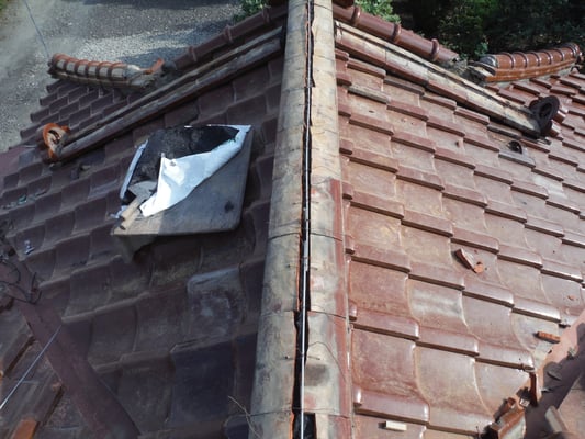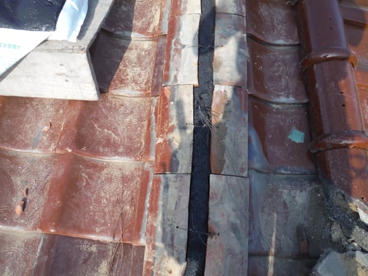 和瓦屋根の傷みが著しく、雨漏れをしている谷板金の修理工事をご依頼頂きました。