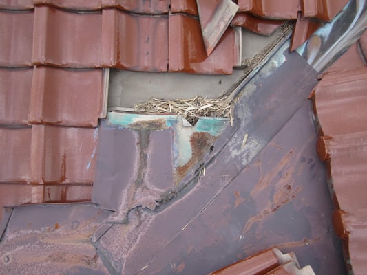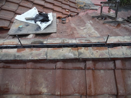 谷板金廻りの地瓦を葺き戻す際に、南蛮漆喰で雀除けの措置を施しました。