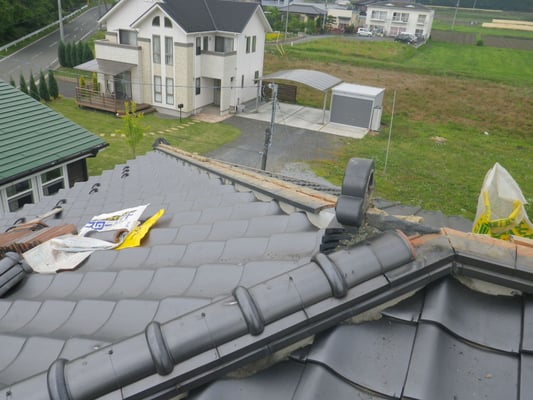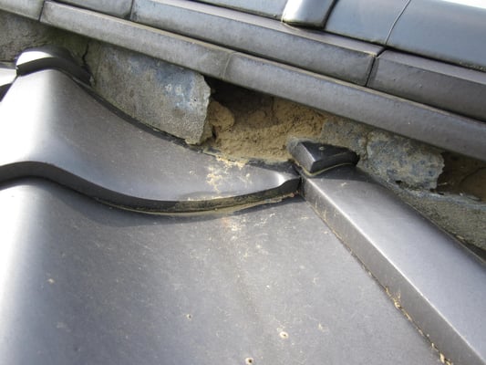 まず、土台粘土と漆喰が崩れている隅棟の様子を確認します。