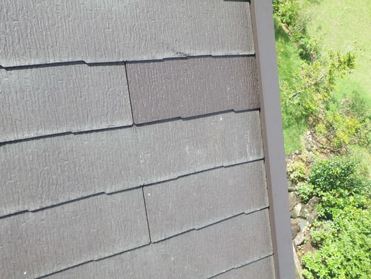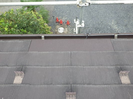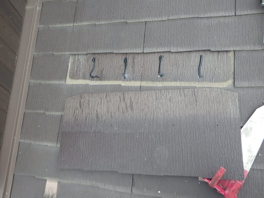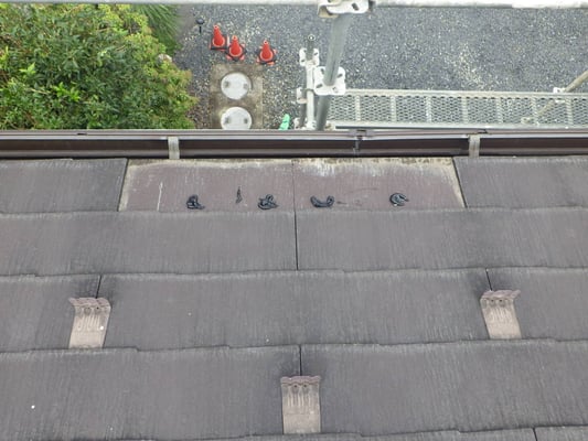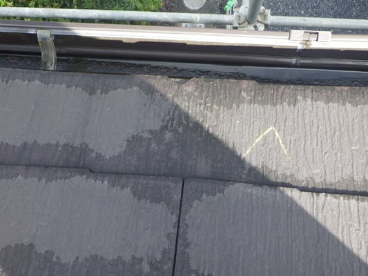 仮設足場を利用し、破損した化粧スレートを撤去し、新規化粧スレートを施工するために、変性シリコンコーキングを近接する化粧スレートに接着させます。