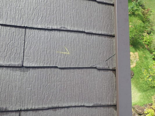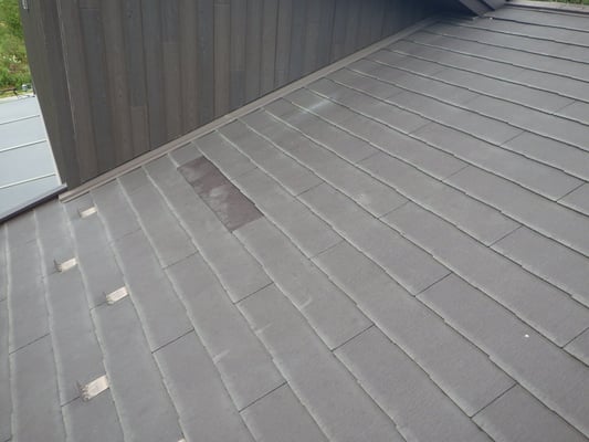 2F屋根からの落雪により、1F屋根の化粧スレート屋根のあちこちにヒビや亀裂が入ってしまった箇所の差し替え工事を行いました。