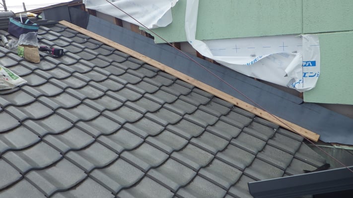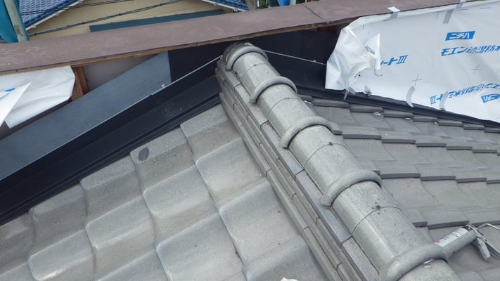 ルーフィングを増す葺きし、壁際取り合いの防水強化を図るために、雨押え水切を新規施工していきます。