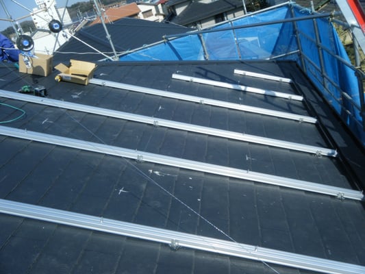 スレート金具の緊結作業を終えたら、太陽光パネルを乗せて固定する、専用架台をそこへ取り付けていきます。
