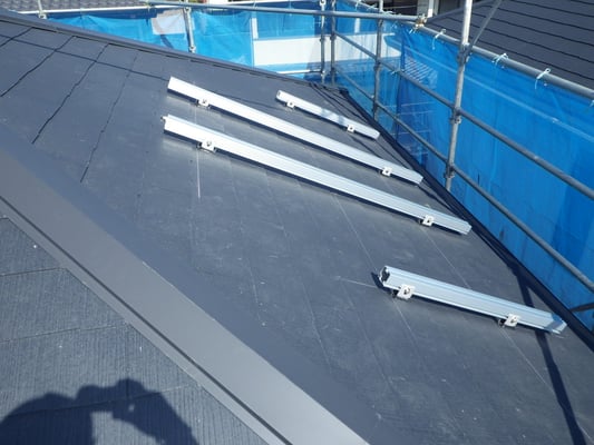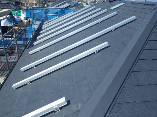 スレート金具の緊結作業を終えたら、太陽光パネルを乗せて固定する、専用架台をそこへ取り付けていきます。